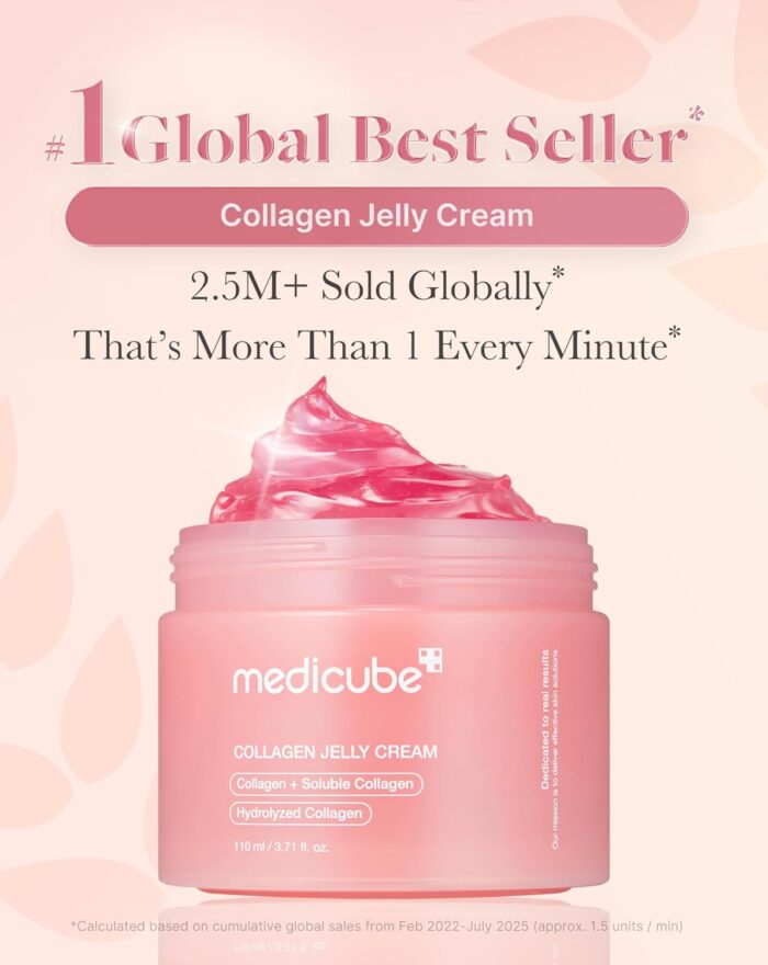 Medicube formula targets uneven skin tone with salmon roe extract, ultra-small collagen, glutathione, and elastin.